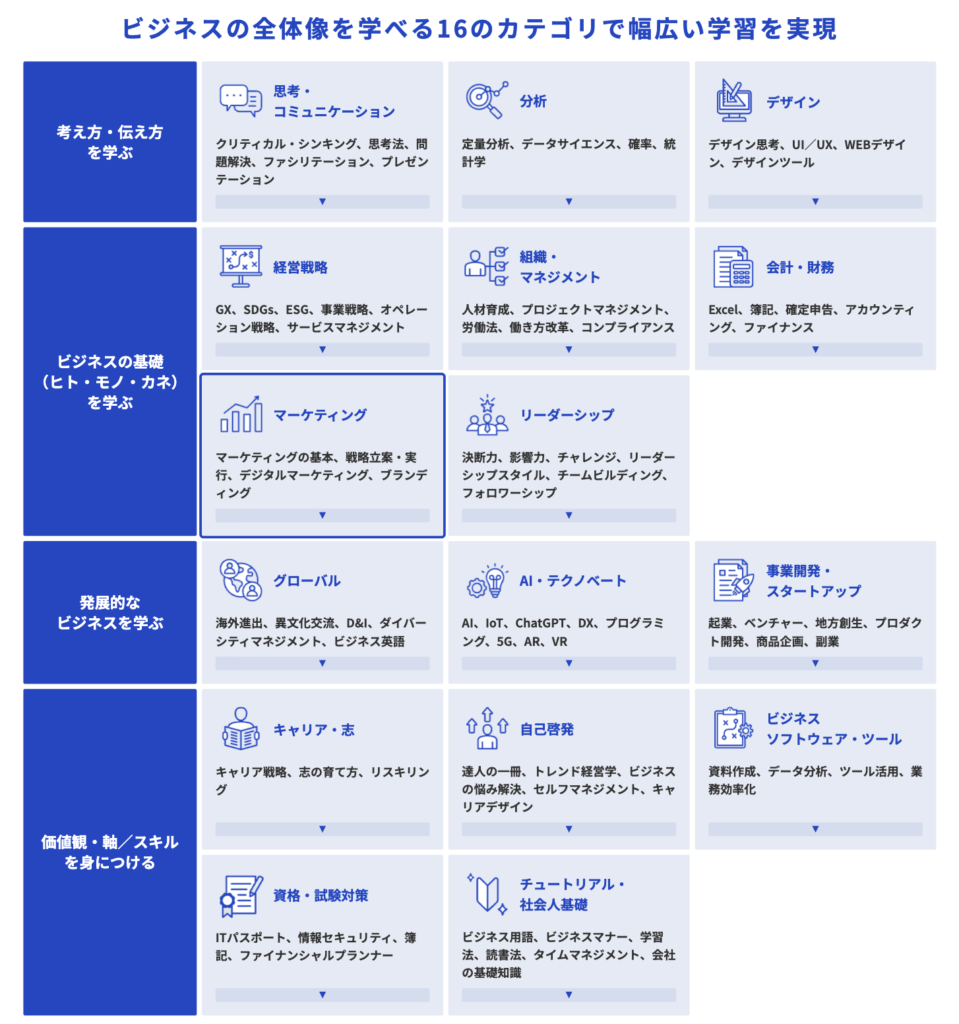 ▼グロービスの特長でもある「MBA」の学習はもちろん、ビジネスで必要な普遍的な学習から 最新のAI・DXなどの専門性の高い学習から資格取得まで16のカテゴリで幅広くカバー