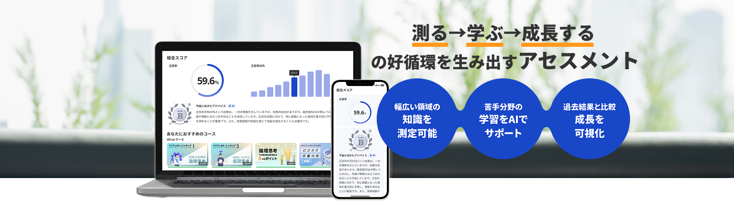 アセスメント機能のあるeラーニングを活用すれば、学習前後のスキルレベルの変化を測定できます。これにより、個々の強みや弱みを客観的に把握し、一人ひとりに最適な学習プランを提示することが可能になります。