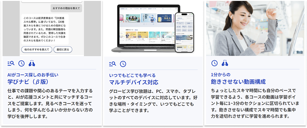 グロービス学び放題 は、1本あたり約3〜5分で構成されたコンテンツが多いため、顧客訪問の合間や移動時間といった「スキマ時間」に、いつでもどこでも学習できる設計になっています。忙しい営業担当者でも学習を継続しやすいのが特長です。