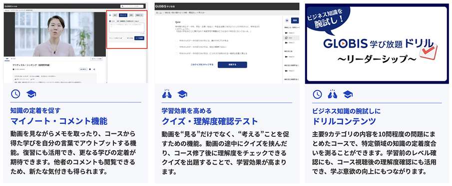 グロービス学び放題 は、インプット学習に加えて、学習した知識をアウトプットする仕組みも用意しています。例えば、演習問題やテスト、AIによるフィードバック機能を通じて理解度を定着させ、知識を実践へと繋げます。