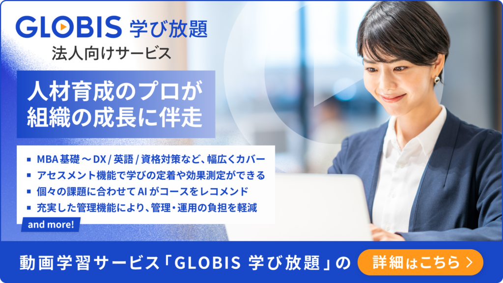 ▼全コンテンツが2週間見放題!グロービスのeラーニング「グロービス学び放題」企業の人事担当者様向け無料トライアルは こちら