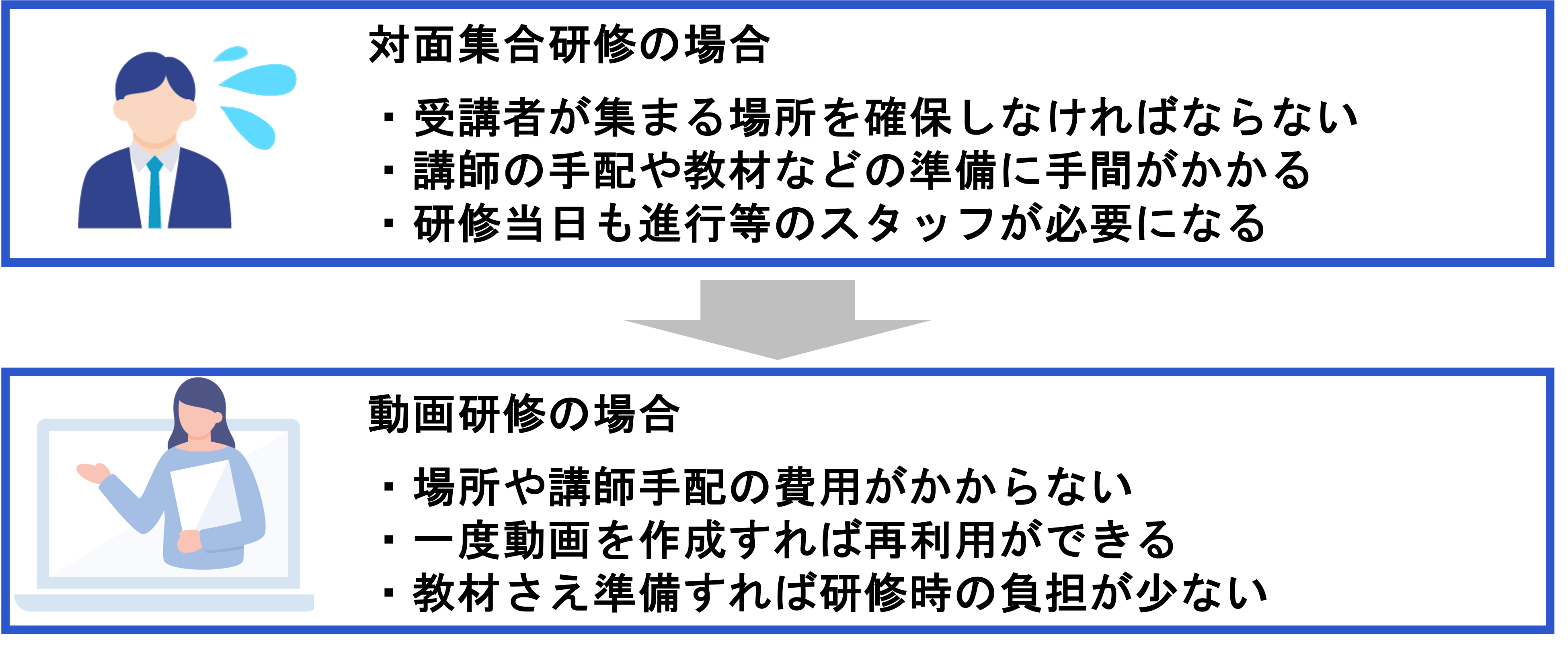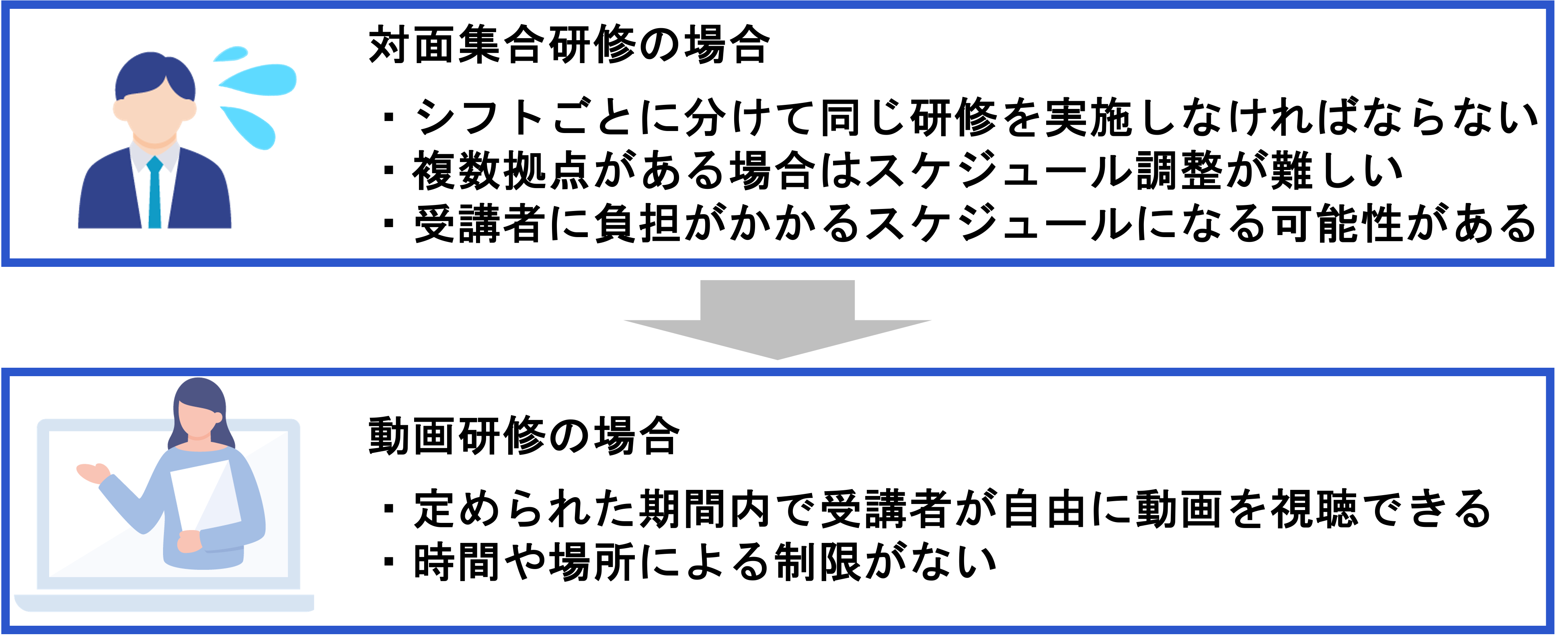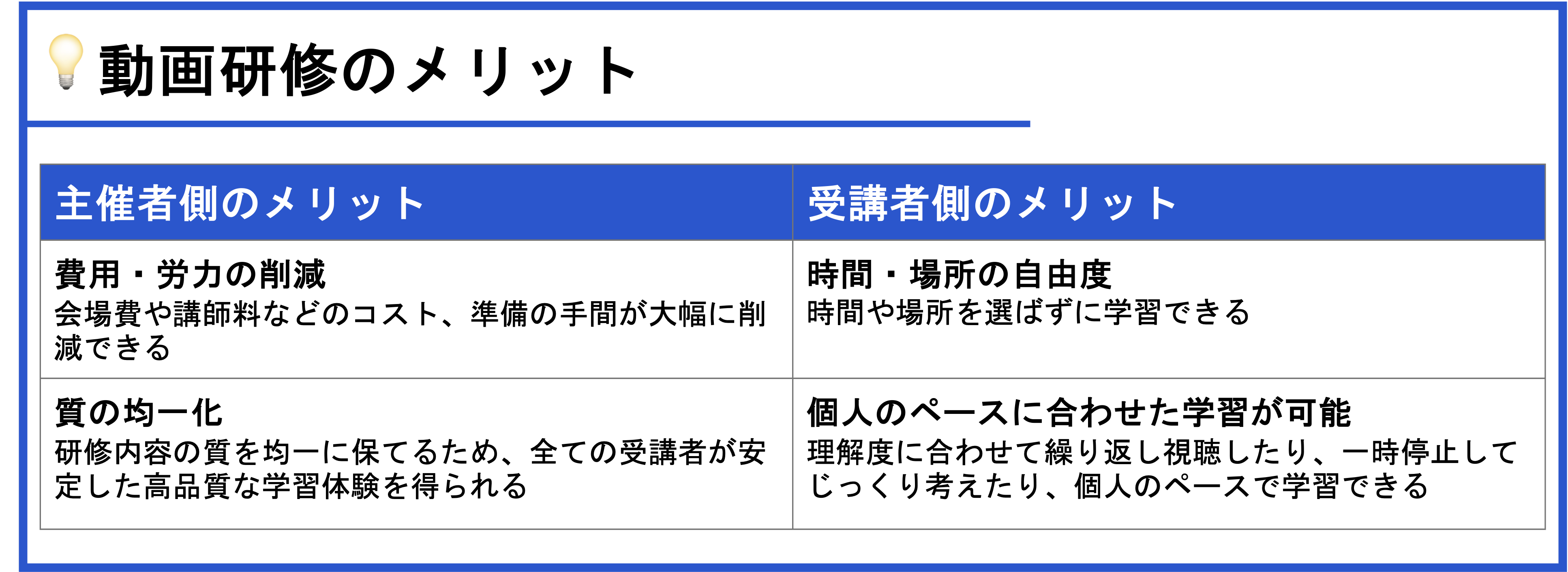 ● 動画研修のメリットは下記の4つ