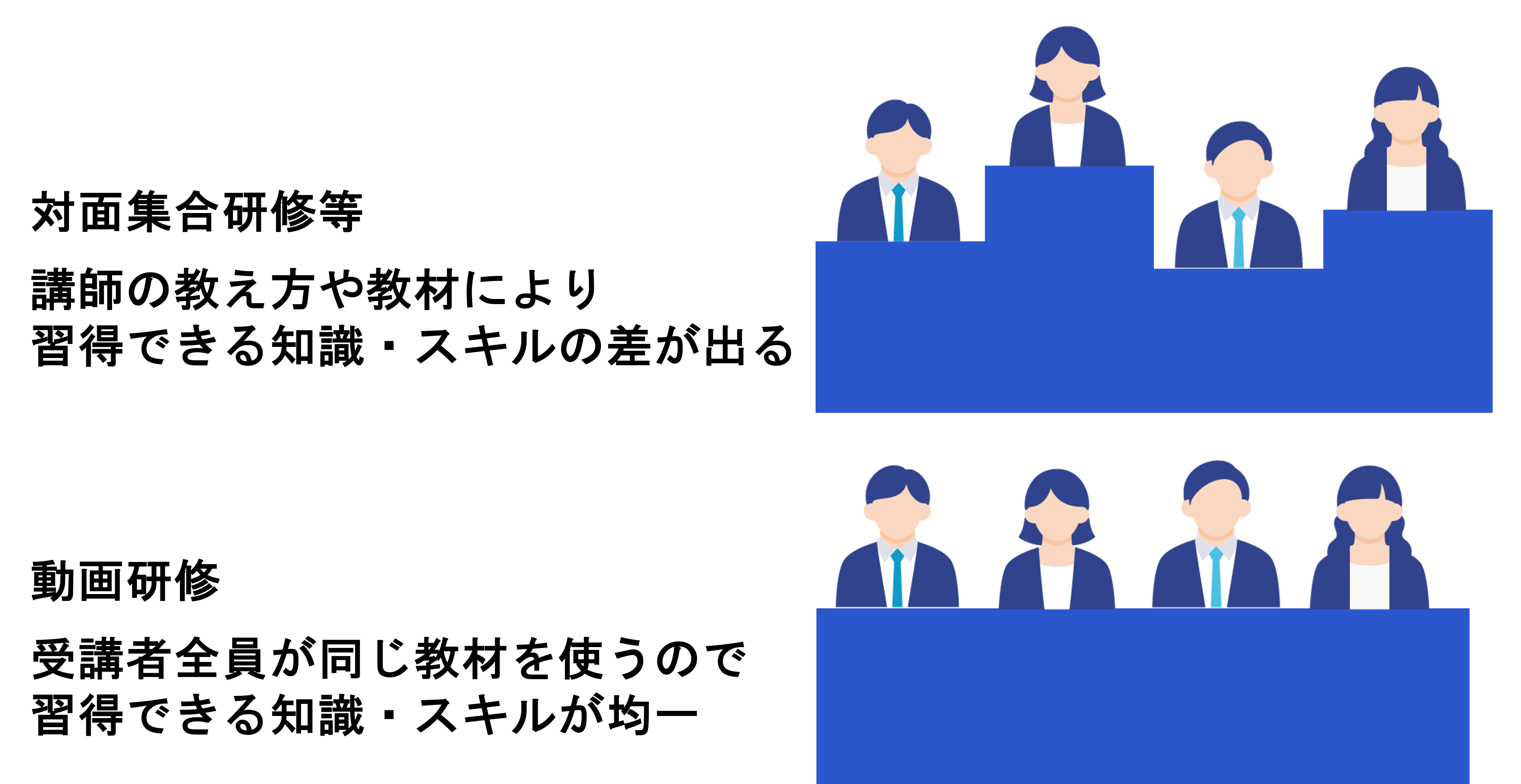 | 階層別の研修 | ⚫︎新入社員、管理職等、階層ごとに必要な知識の習得 ⚫︎集合研修の予習復習や昇進昇格のための学習 |
