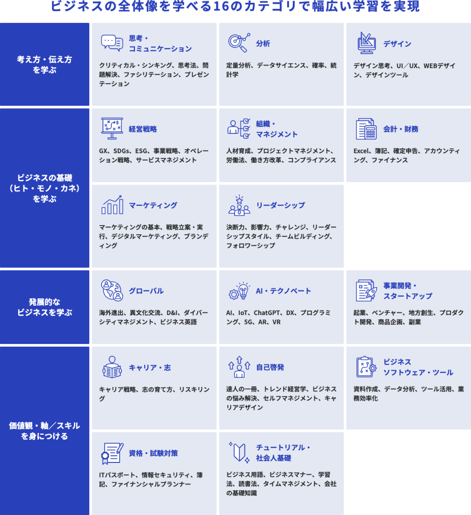 MBAのエッセンスだけでなく、AI、DX、資格取得など幅広い領域をカバーしているため、普遍的なビジネスナレッジから最新のテクノロジーまで、幅広い領域を体系的に学べるのが特長です。