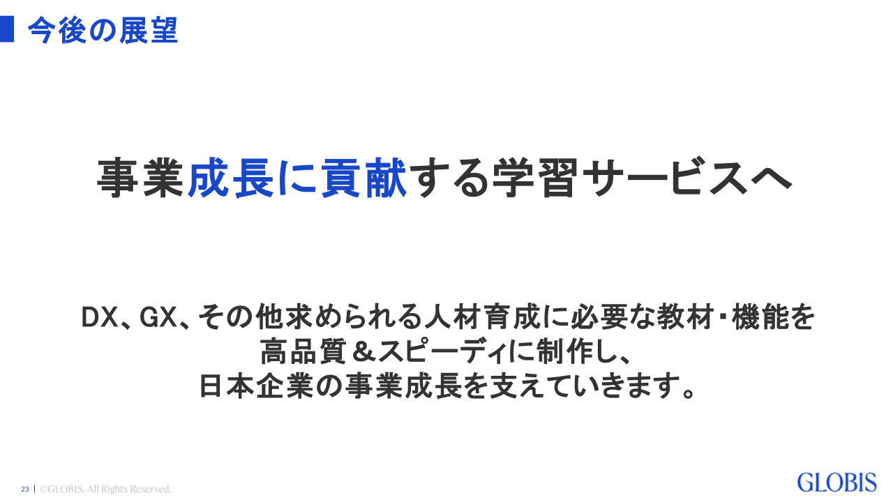 オープニングトーク終盤には、「事業の成長に貢献する学習サービス」という展望と共に今後の開発方針が示されました。