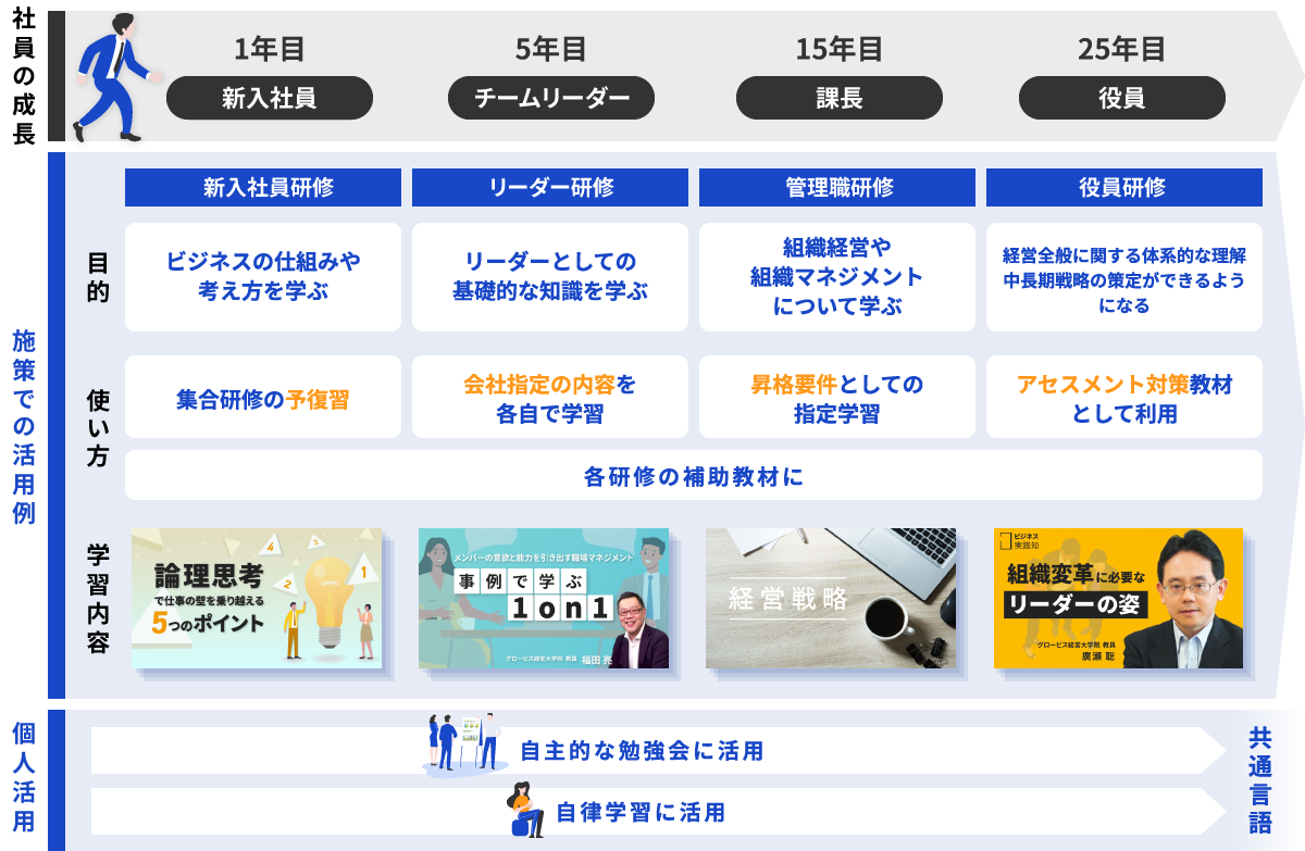 例えば、「グロービス学び放題」では、以下の図のように新入社員研修から役員研修まで、それぞれの階層で必要とされるスキルセットを体系的にインプットが行えます。