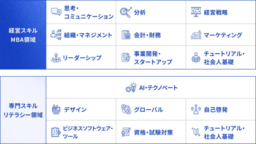 最新のAI・DXなどの最新の学びから、資格取得に活用できる専門性の高い内容までカバー。評価制度における多様なポイントと連動できます。