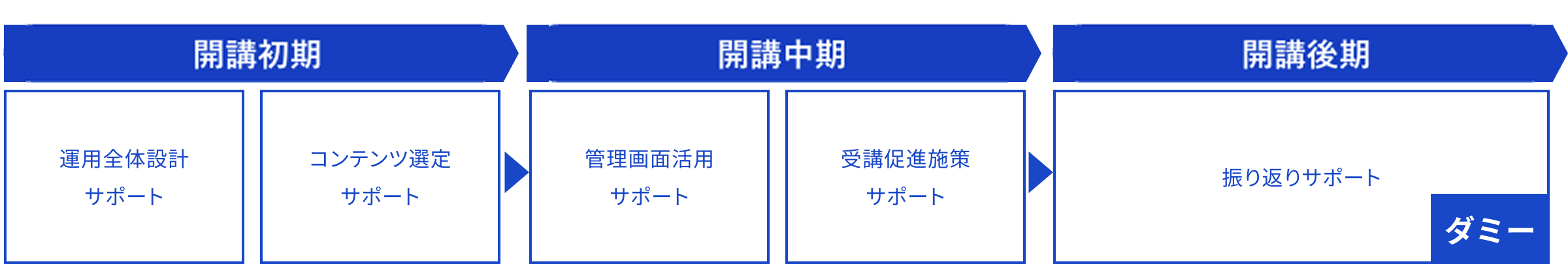 受講者の受講支援および管理者への管理機能の使い方の説明を行います。目的や課題に応じて必要なツールや資料をご提供し、短期間での運用開始を実現します。