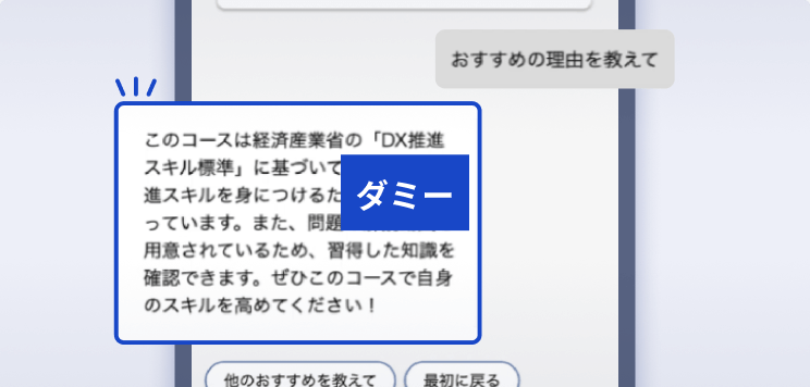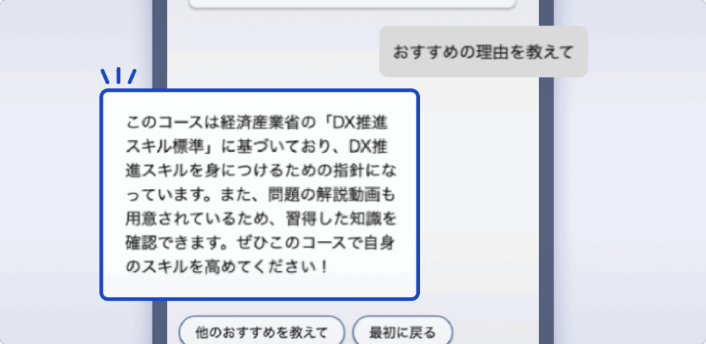 受講者が関心のあるテーマを入力すると、AIがマッチするコースを探して提案します。応援コメント付き。
