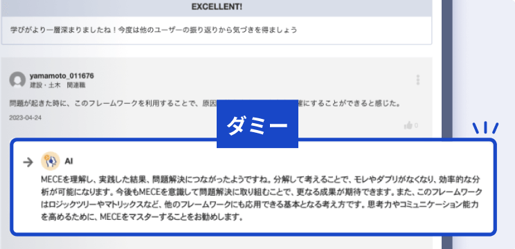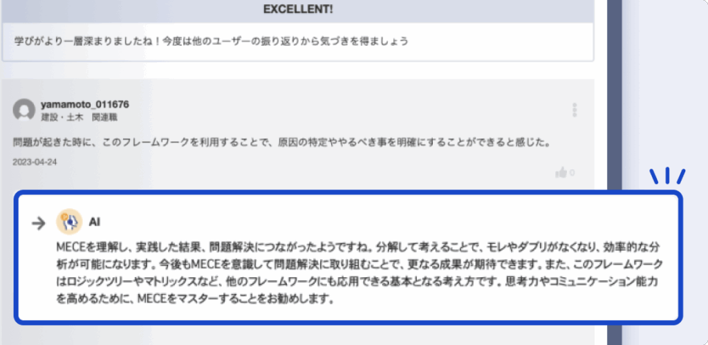 AIが受講者の振り返りコメントにフィードバックを行います。学習内容の理解とモチベーションの向上を後押しします。